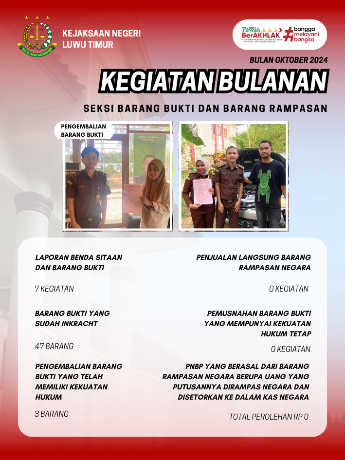 Pada bulan Oktober, bidang PB3R Kejaksaan Negeri Luwu Timur tidak hanya fokus pada pemeliharaan barang bukti, tetapi juga memberikan pelayanan publik dengan melakukan pengembalian barang bukti yang sudah memiliki kekuatan hukum tetap (inkracht). Berikut kegiatan yang telah dilaksanakan bidang PB3R Kejaksaan Negeri Luwu Timur: